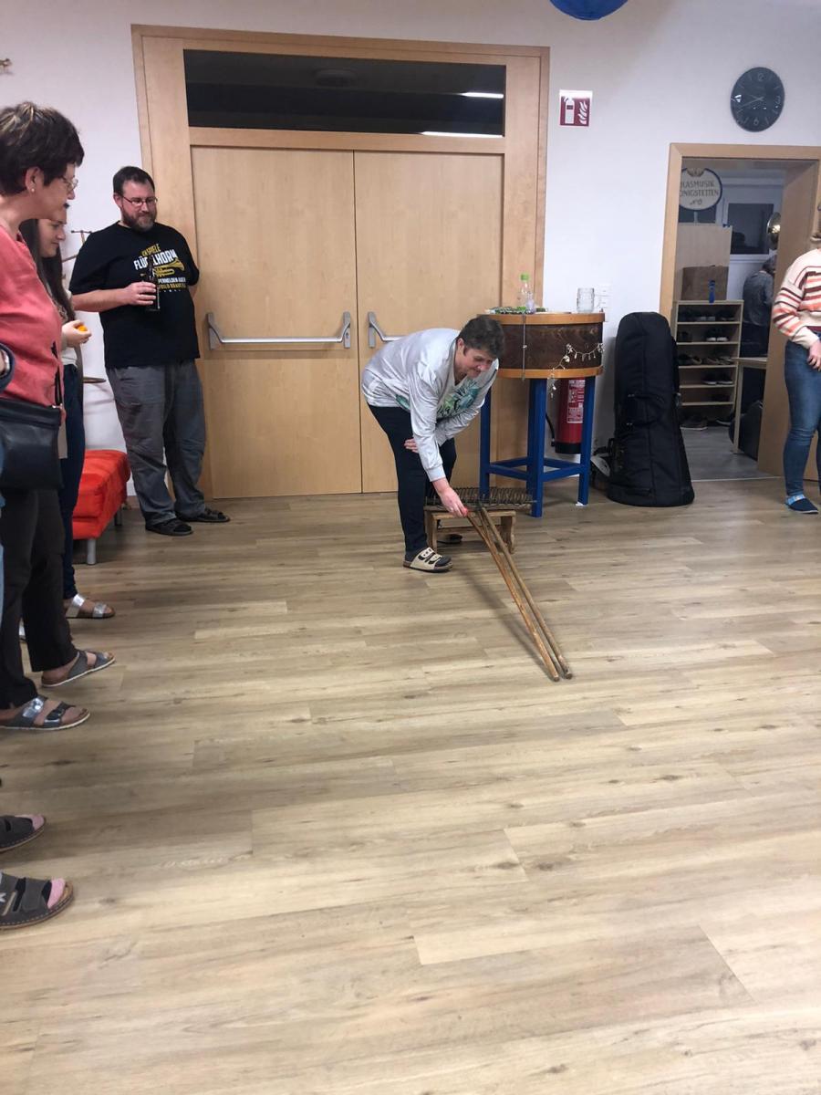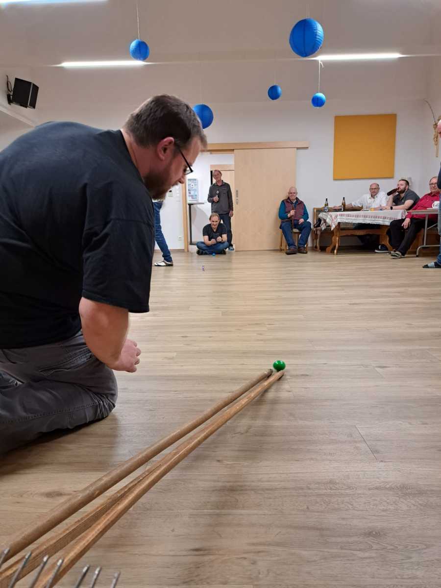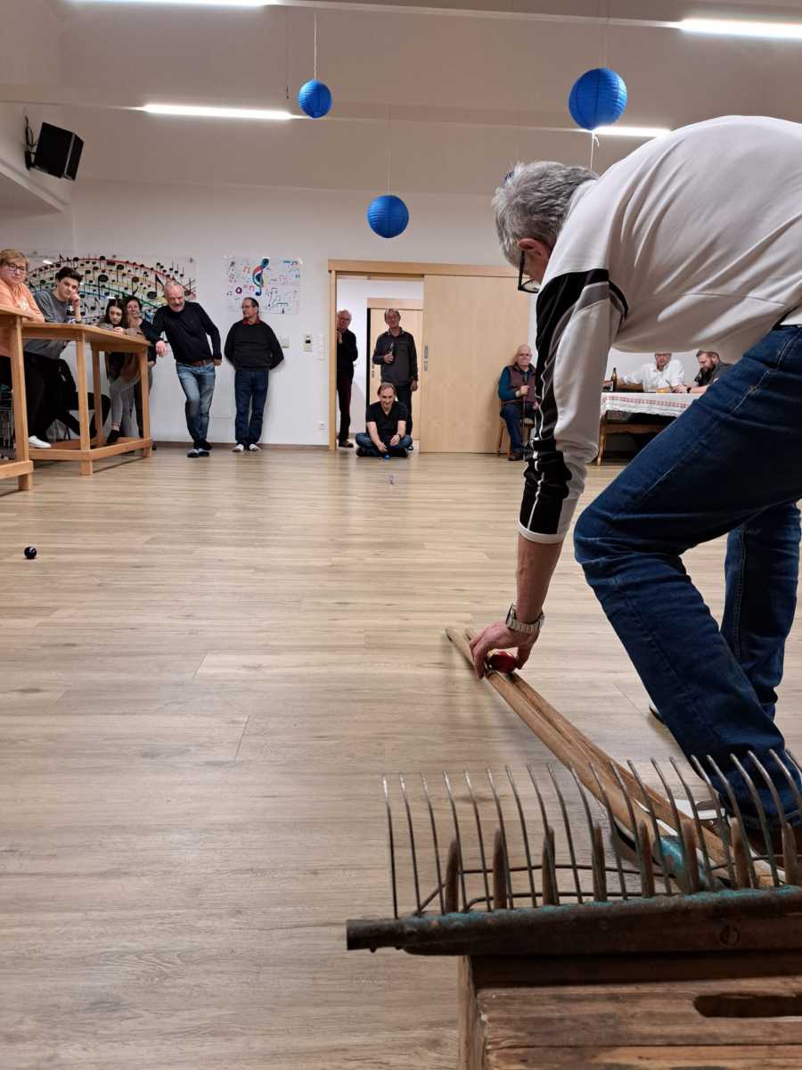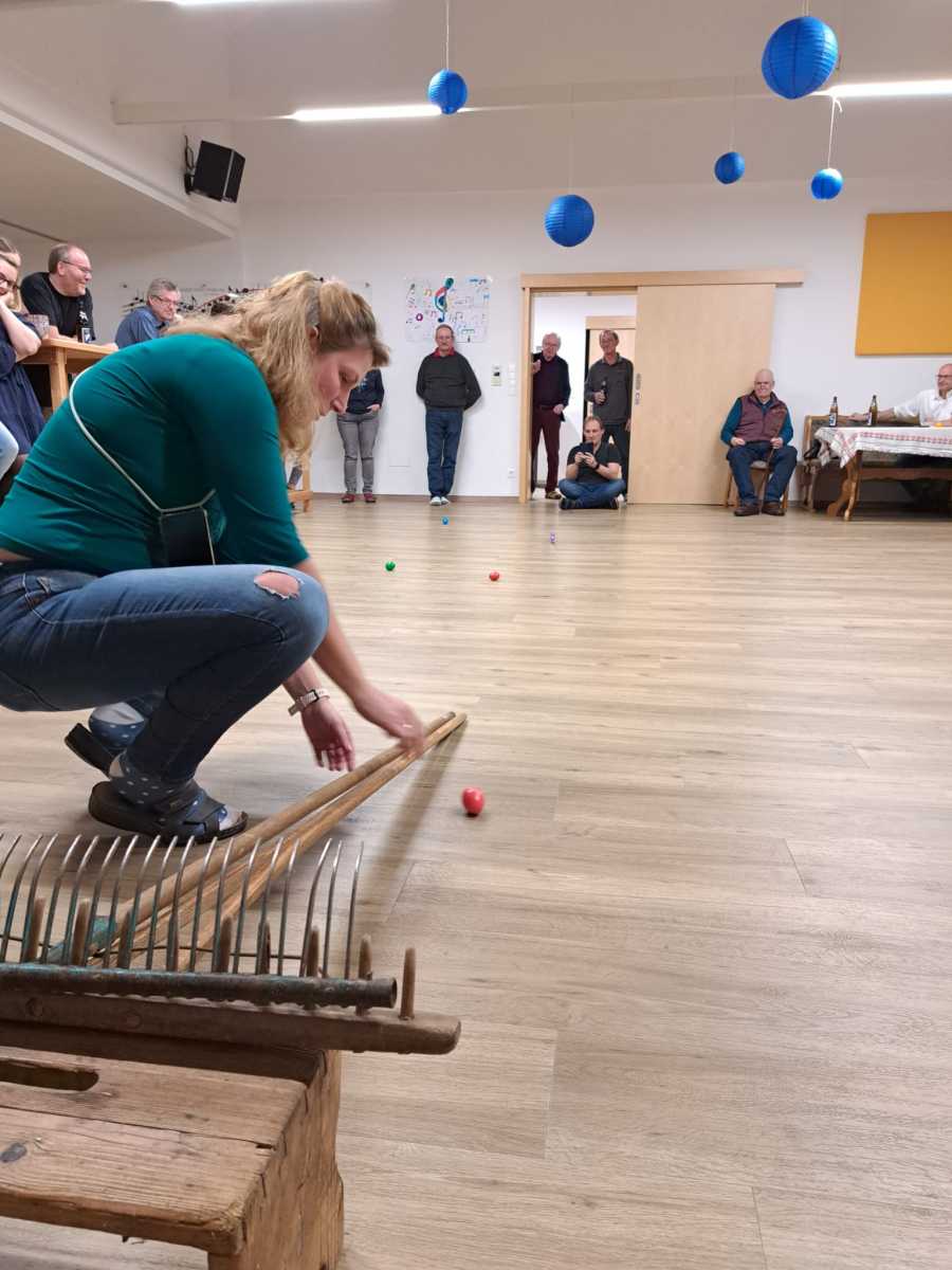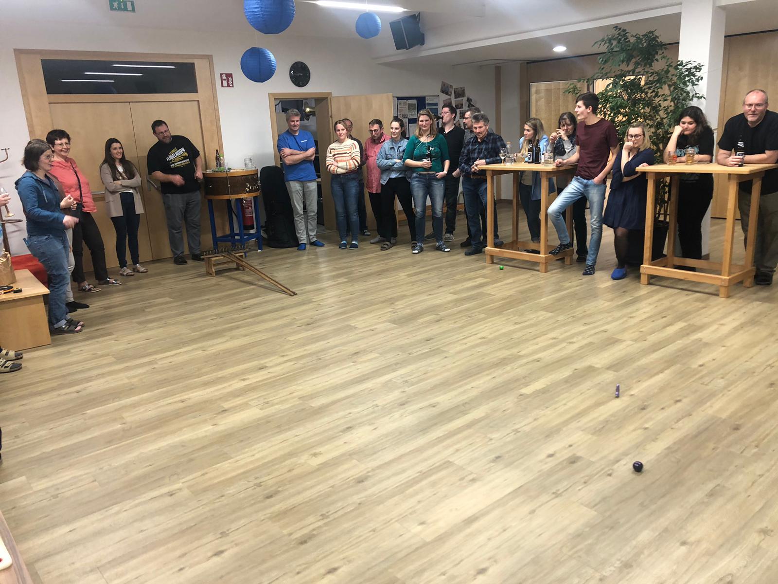 Heute Abend überraschte uns das „hohe Blech“ mit einem bayrischen Osterbrauch. Beim „Oascheim“ werden gekochte Eier über ein Schienengestell, welches aus zwei Rechen besteht, zu einem fixen Zielpunkt gerollt. In unserem Reglemet wurde dies leicht abgewandelt.
