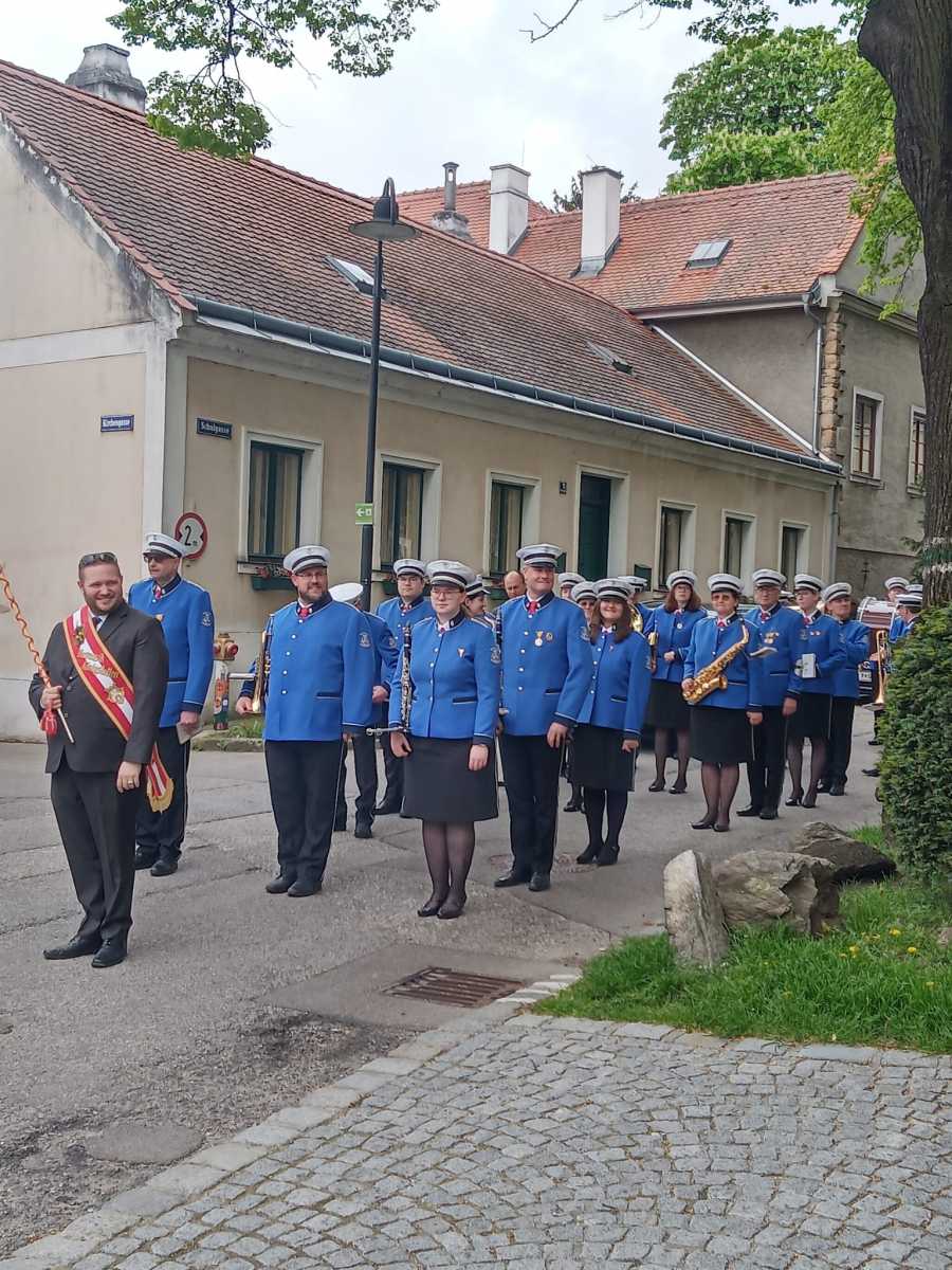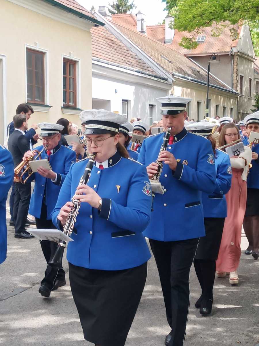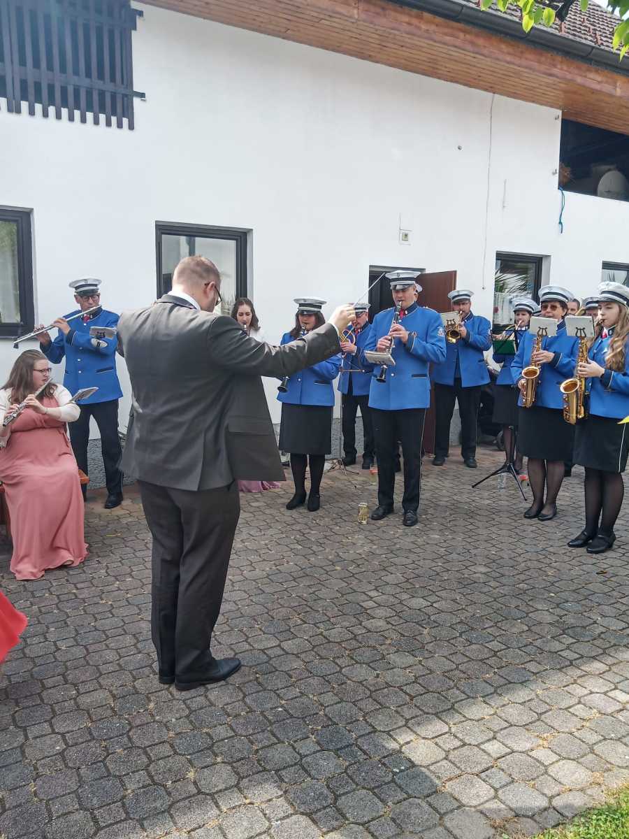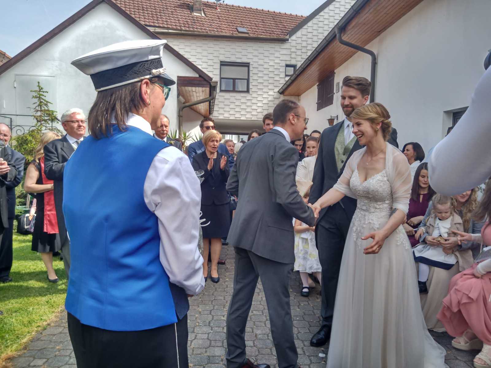 Nachdem wir alle mitgefiebert und brav aufgegessen hatten, durften wir das Brautpaar inkl. Hochzeitsgesellschaft bei der Kirche abholen und bei Sonnenschein in den Hof des Heuriger Nagl Josef begleiten. Während wir einige Stücke unseres Repertoires zum Besten gaben, wurde fleißig gratuliert und angestoßen.
