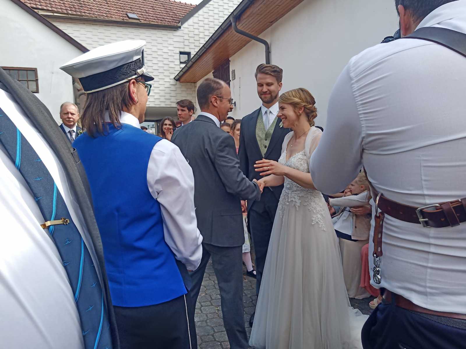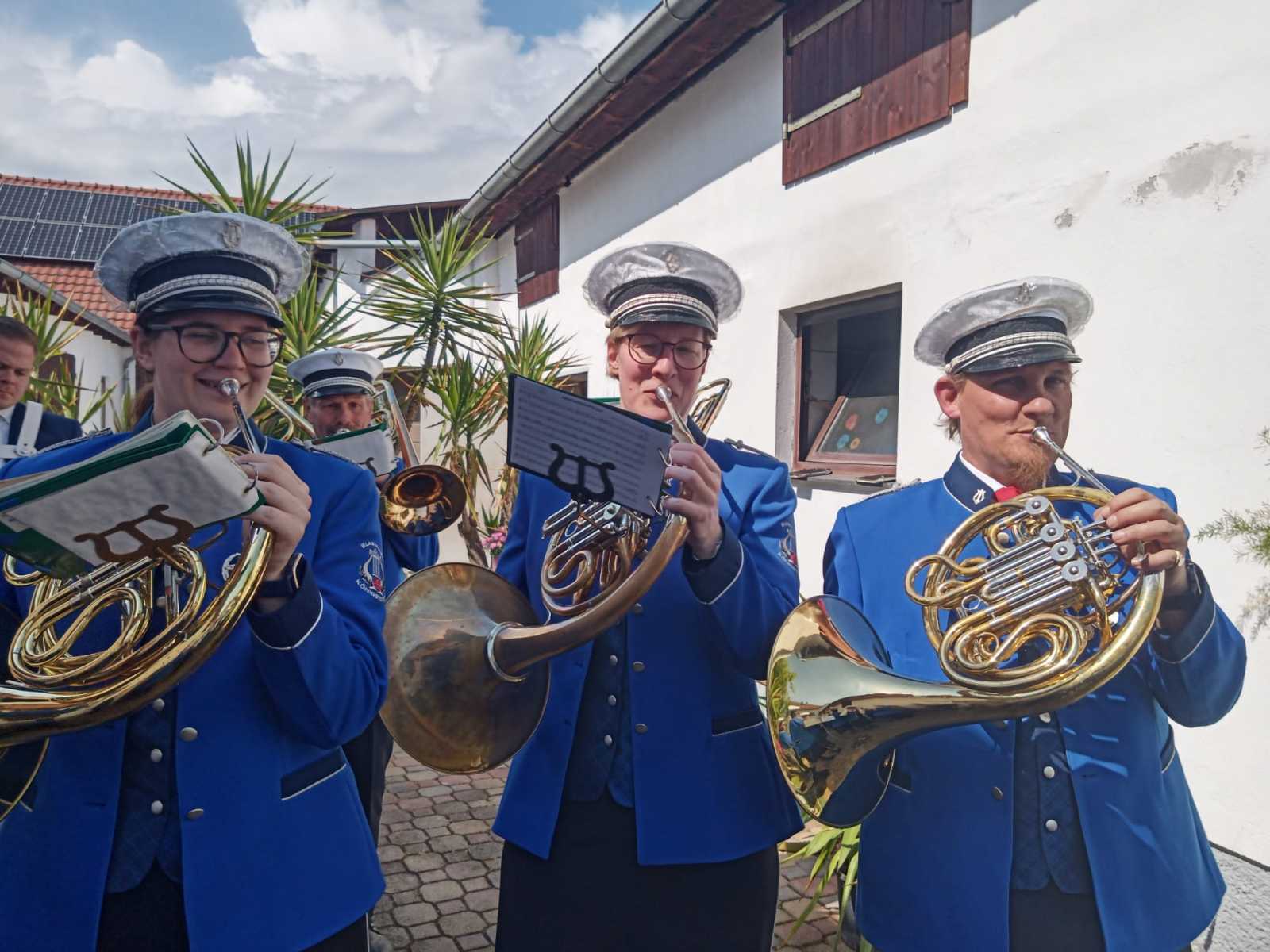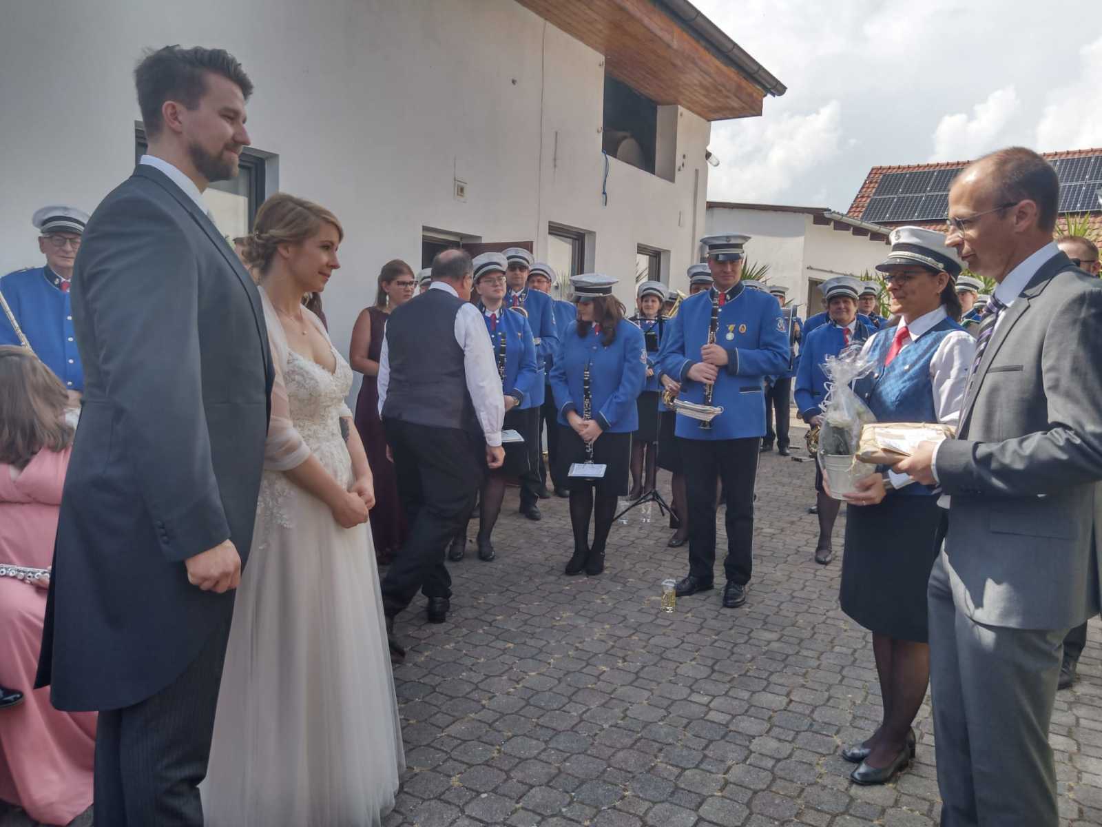 Nachdem wir alle mitgefiebert und brav aufgegessen hatten, durften wir das Brautpaar inkl. Hochzeitsgesellschaft bei der Kirche abholen und bei Sonnenschein in den Hof des Heuriger Nagl Josef begleiten. Während wir einige Stücke unseres Repertoires zum Besten gaben, wurde fleißig gratuliert und angestoßen.