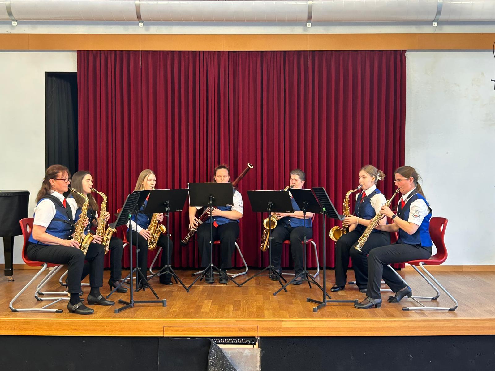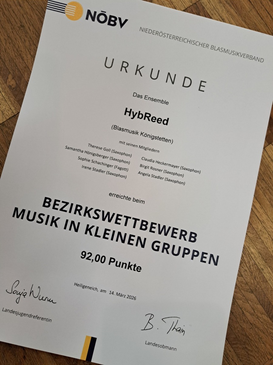 Das Ensemble HybReed, bestehend aus Irene Stadler, Claudia Heckermayer, Therese Goll, Samantha Hönigsberger, Birgit Rosner, Angela Stadler (Sopran- bis Tenorsaxophon) und Sophie Schachinger (Fagott), überzeugte die Jury mit ihrer musikalischen Darbietung und wurde mit hervorragenden 92 Punkten belohnt!