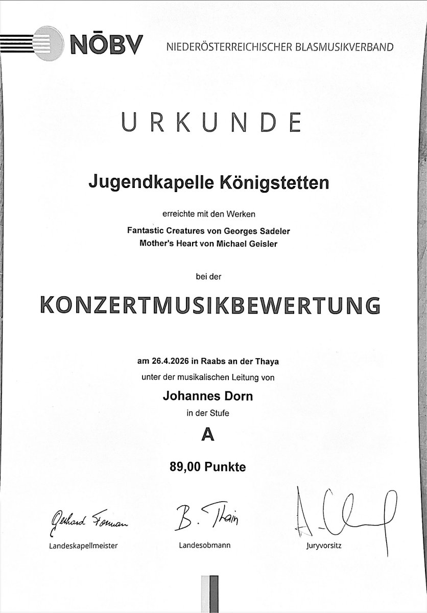 Unser Ziel war Raabs an der Thaya, wo wir am Vormittag an der Konzertmusikbewertung teilnahmen. Mit den Stücken „Fantastic Creatures“ von Georges Sadeler und „Mother’s Heart“ von Michael Geisler erspielten wir unter der Leitung von Kpm. Johannes Dorn in der Stufe A hervorragende 89 Punkte!